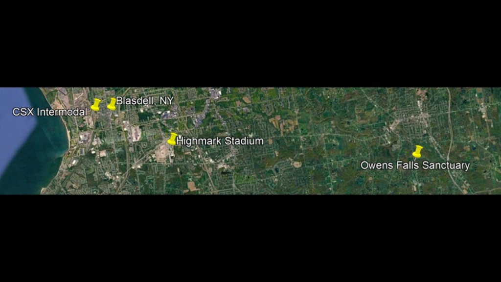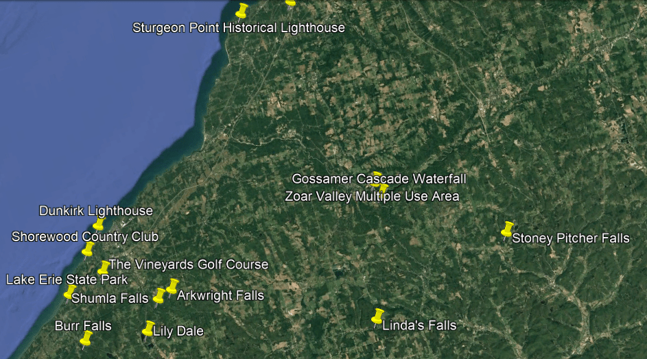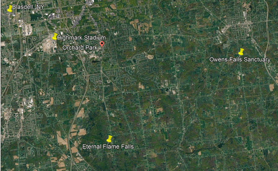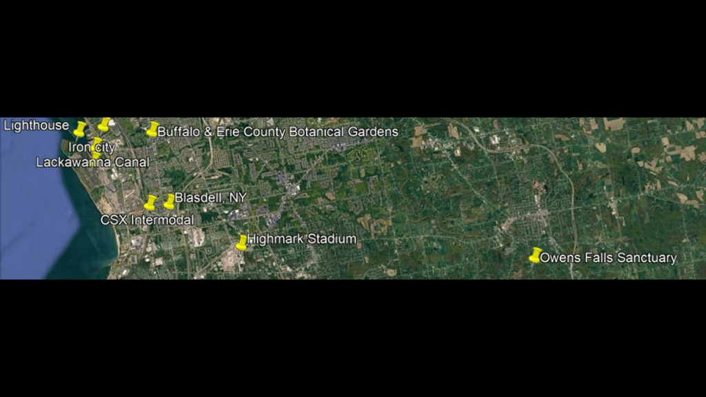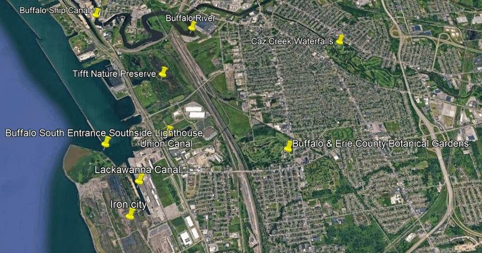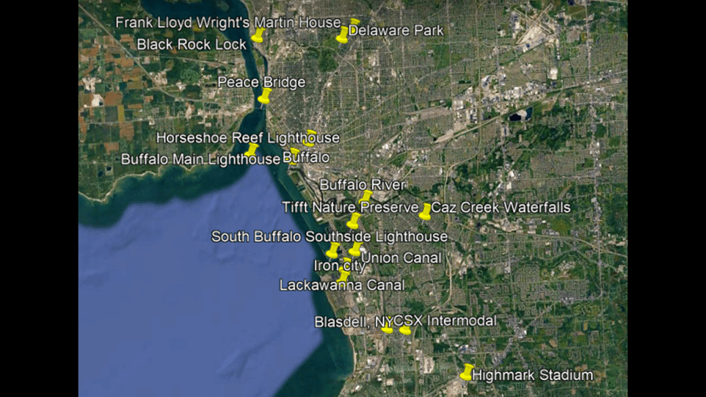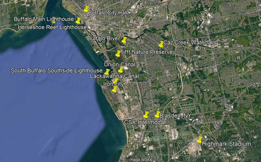 These are some of the places I am going to be looking at in the Buffalo-area, including places like the Black Rock Lock; the Peace Bridge; Delaware Park and the Martin House attributed to Frank Lloyd Wright, the Buffalo River; the three lighthouses in Buffalo; some of the canals in Buffalo; the Caz Creek Waterfalls, the Tifft Nature Preserve; Highmark Stadium; and a few other places as well.