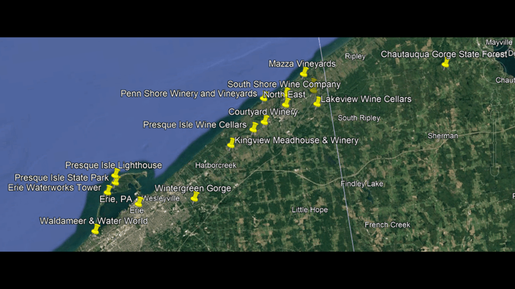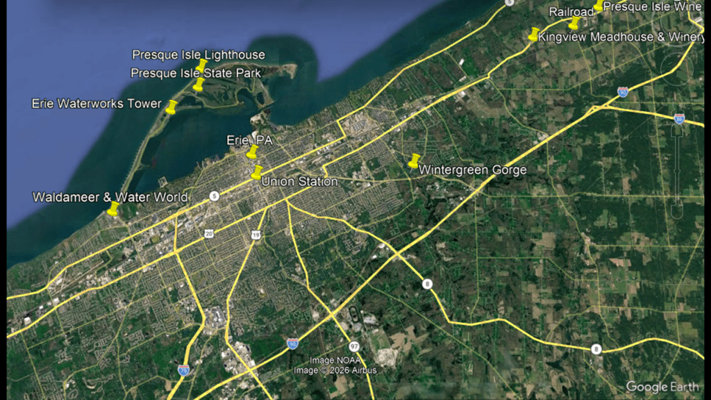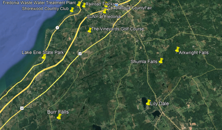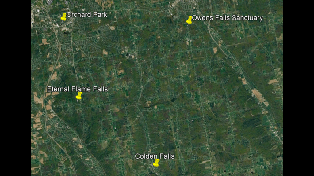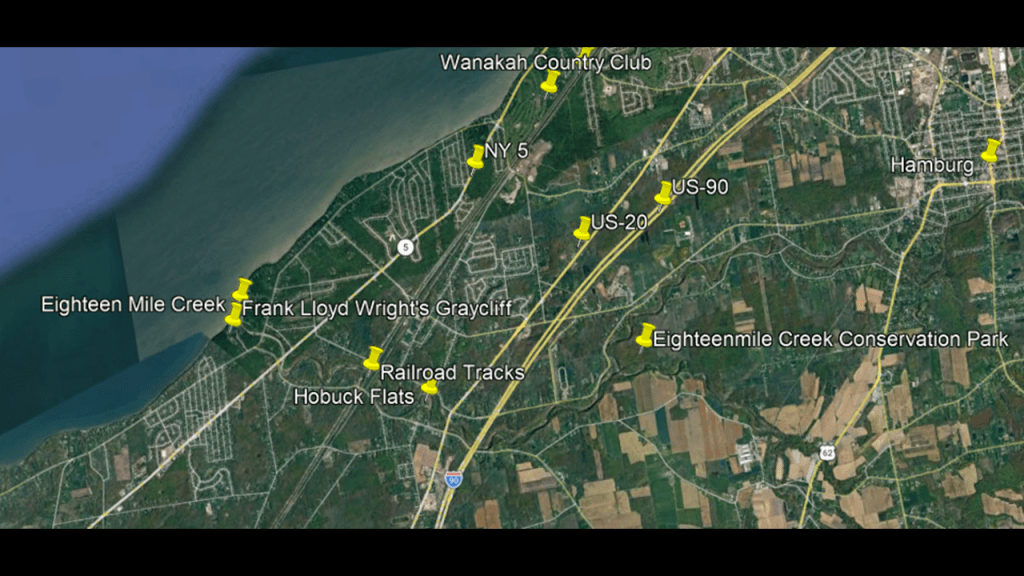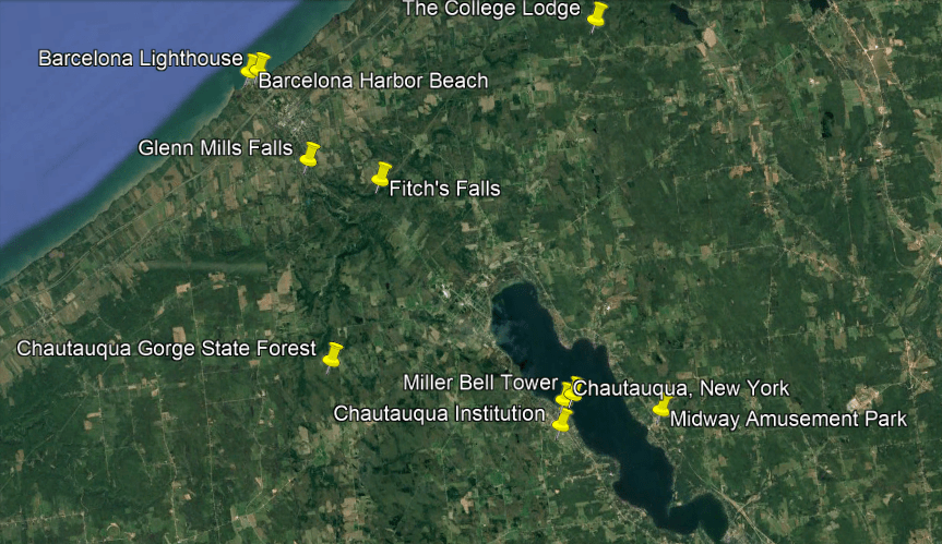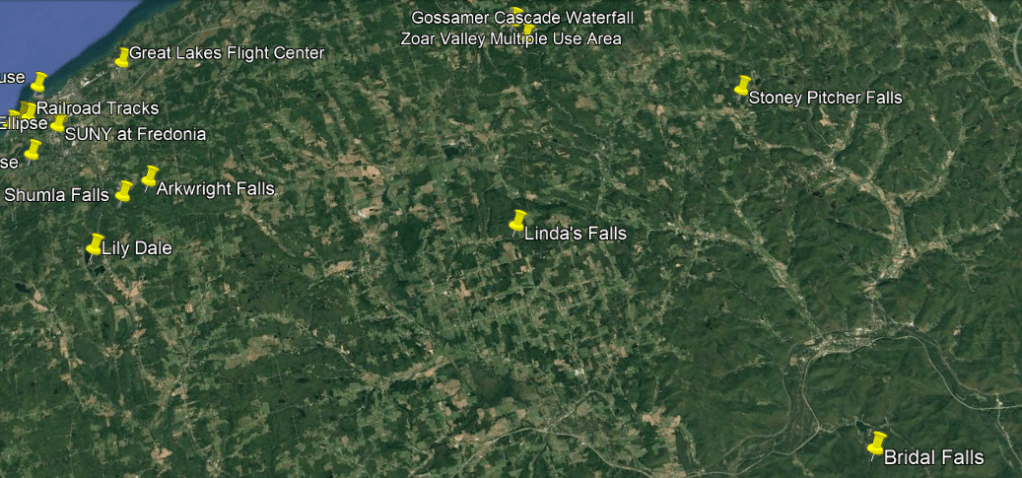 These are some of the places I am going to be looking at in the Buffalo-area, including places like the Black Rock Lock; the Peace Bridge; Delaware Park and the Martin House attributed to Frank Lloyd Wright, the Buffalo River; the three lighthouses in Buffalo; some of the canals in Buffalo; the Caz Creek Waterfalls, the Tifft Nature Preserve; Highmark Stadium; and a few other places as well.