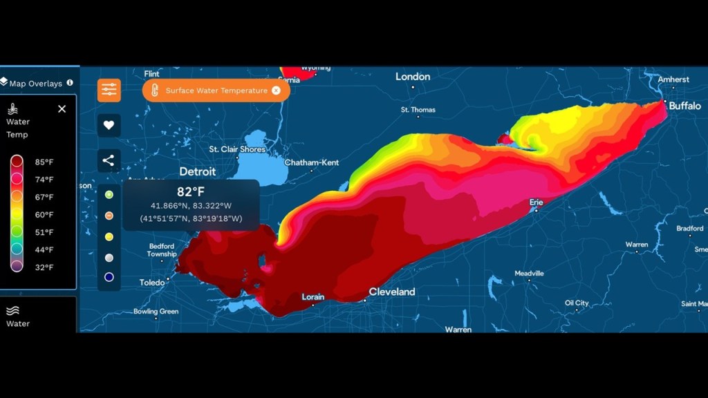 Lake Erie is also the warmest of the Great Lakes because it is the shallowest, and frequently reaches peak water temperatures in the 70 to 80-degree Fahrenheit-range, or upper 20-degree-Celsius-range, in the summer months of July and August, and more during heat waves.