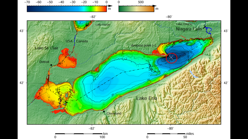 The Eastern Basin is the deepest, with depths ranging from 0- to 64-meters, or 0- to 210-feet, where the deepest point of Lake Eriemarked by an “X” circled in red, making it the only Great Lake whose deepest point is above sea-level.