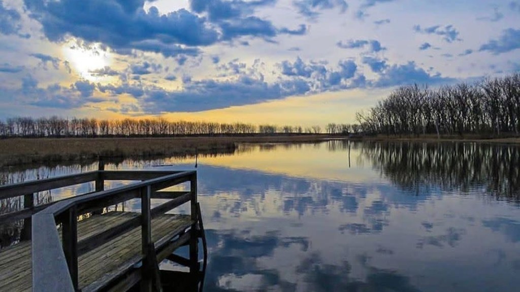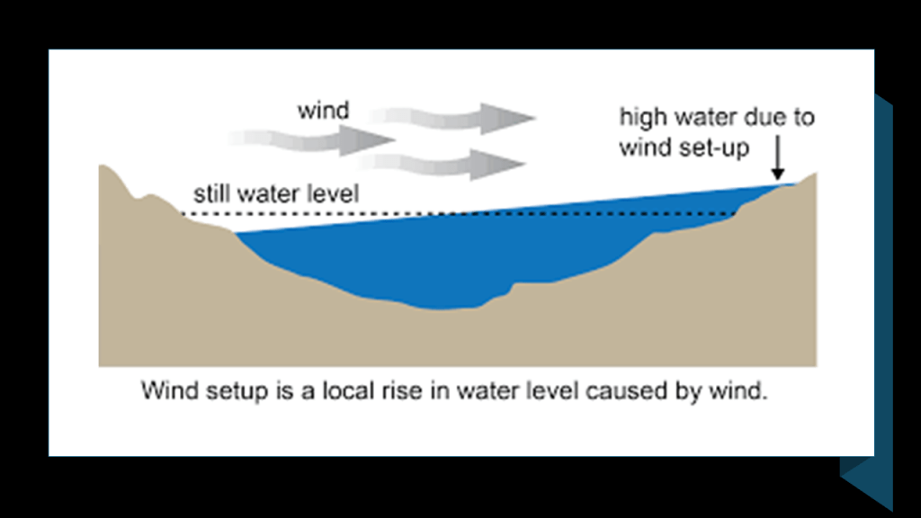 The depth contrast of the shallow western-end and the deep eastern-end causes water to pile-up when strong winds push the lake-water east or west.