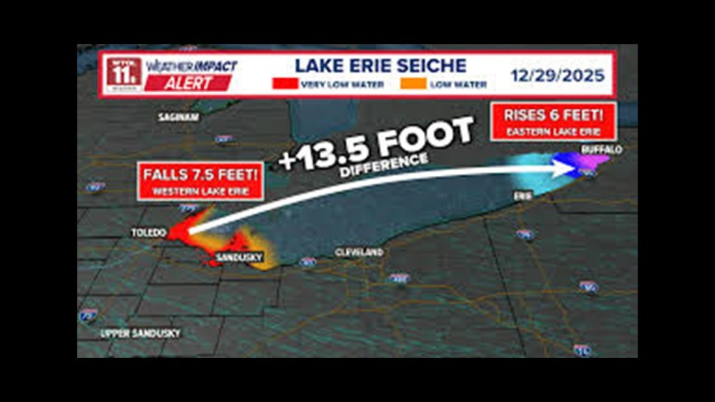This results in a phenomenon known as a “seiche,” which happens strong winds push the lake water east or west, causing the water to pile up, or drain, and which Lake Erie is more prone to than the other Great Lakes.