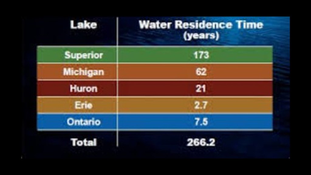 Lake Erie also has the shortest average water residence time of the Great Lakes at 2.7-years, meaning the average time that water spends in a particular lake.