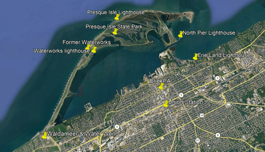 So far I have looked in-depth at cities and places all around the shores of Lake Superior, Lake Michigan, Lake Huron, and Lake Ontario, paying particular attention to lighthouses; railroad and streetcar history; waterfalls, wetlands and dunes; interstates and highways; golf courses, airports and race tracks; major corporate players; mines and mining; labor relations; and many other things.