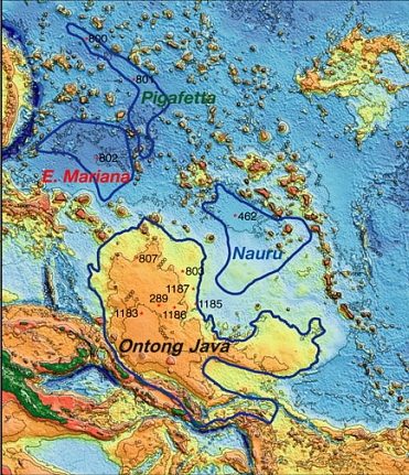 The islands of the Ongtong Java Atoll are described as seamounts, punctuating the otherwise smooth surface of the Ongtang Java Plateau, which is described as a “flood basalt feature.”