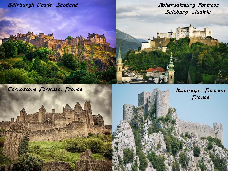 The appearance of the castle above the city immediately brought to mind Edinburgh Castle in Scotland on the top left; Hohensalzburg Fortress in Austria on the top right; Carcassone Fortress in southern France; and Montsegur Fortress in southern France.