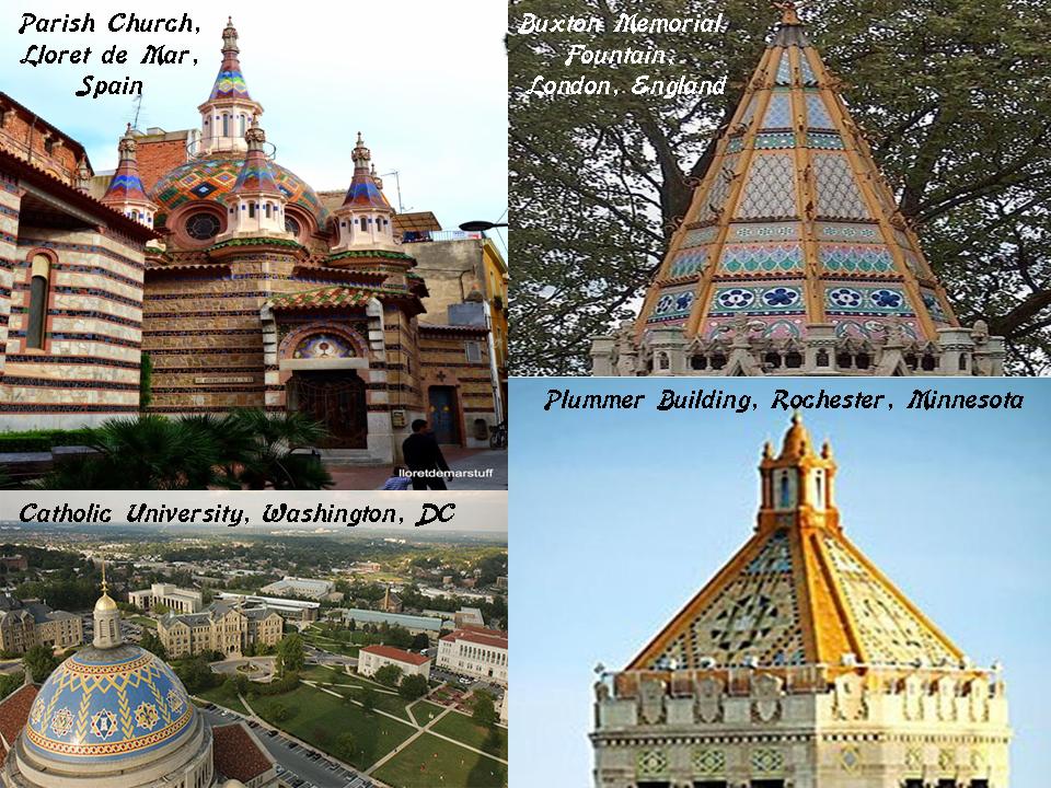 I also remembered seeing the colorful dome of this place on the top left in Lloret-de-Mar. Come to find out that it is the Parish Church of Lloret-de-Mar. For comparison of fine design and color, I have included the Buxton Memorial Fountain in London, England on the top right; the dome of the Basilica of the National Shrine of the Immaculate Conception at Catholic University in Washington, DC, on the bottom left; and the Plummer Building of the Mayo Clinic in Rochester, Minnesota, on the bottom right.