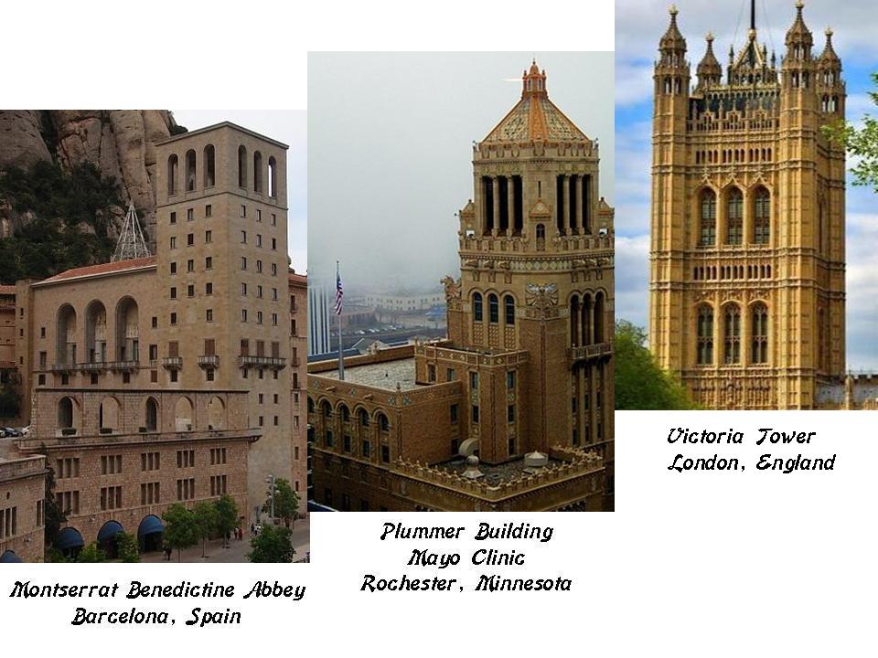 Here is a comparison of the similar features of this tower at Montserrat on the left, with those of the Plummer Building in Rochester, Minnesota, in the middle, and the Victoria Tower at Westminster Palace in London, England, on the right.