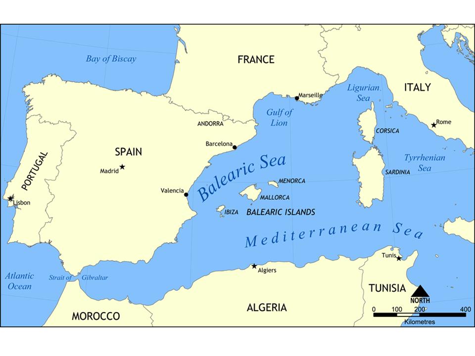 From Barcelona, the alignment enters the Balearic Sea of the Mediterranean Sea on its way to the island of Majorca, or Mallorca, the largest of the Balearic Islands.