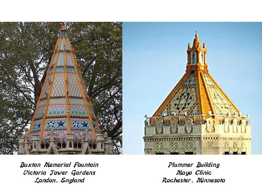 On the left is the Victoria Tower in the Westminster Palace complex in London, the building of which is said to have been completed in 1860, and on the right is the Plummer Building of the Mayo Clinic in Rochester, Minnesota, said to have opened in 1928.