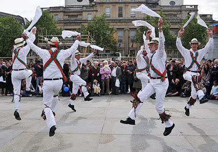 Then there are Morris Dancers in England, who practice a group dance form of choreographed steps, with bells on the knees, and wielding sticks, swords, or handkerchiefs.