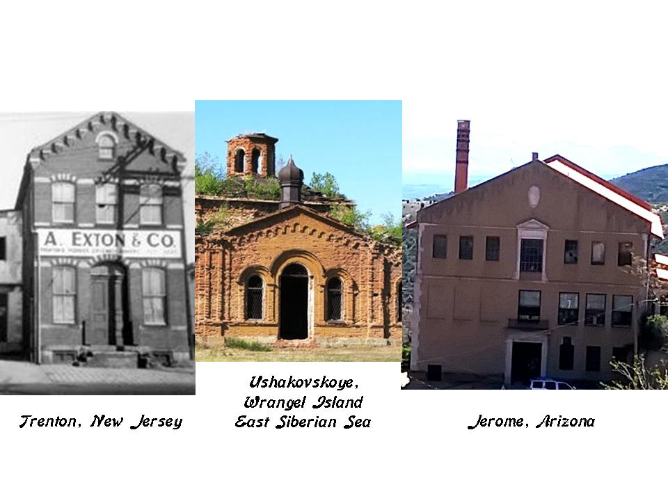 This building in Trenton was the Exton Mill on the left, compared with the design features of what is called an old church at the abandoned settlement of Ushakovskoye, on Wrangel Island on the East Siberian Sea in the middle; and that of the building in Jerome, Arizona, on the right.