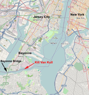 Upper New York Bay is connected to the Newark Bay by the Kill Van Kull, what is called a tidal strait between Staten Island, New York, and Bayonne, New Jersey.
