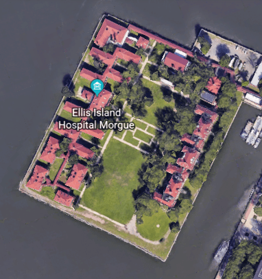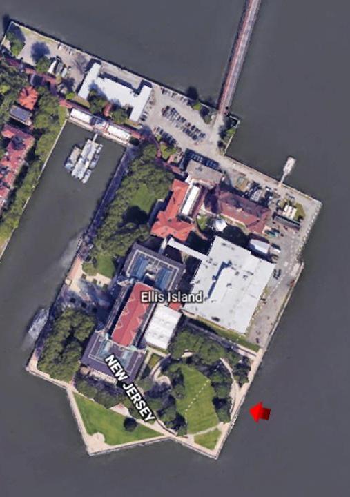 This is an aerial of the north side of Ellis Island from Google Earth showing a circular feature on the grounds…