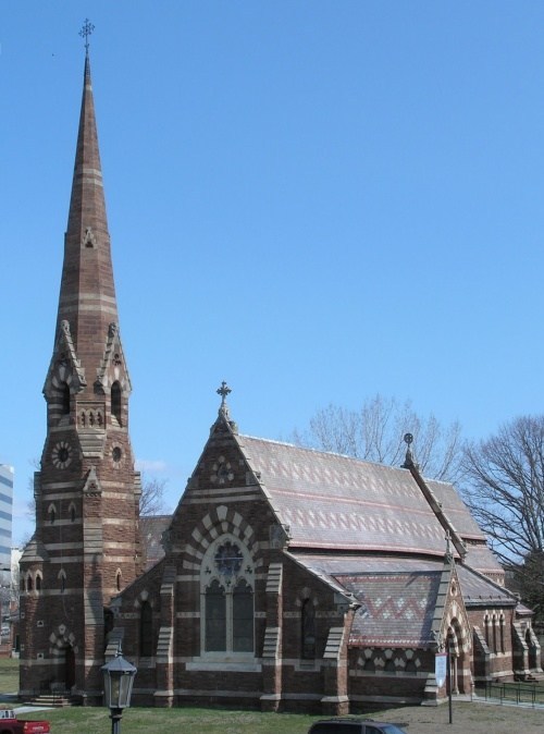 This is the Church of the Good Shepherd in Hartford. It is connected to the firearm-manufacturing Colt family, as it is said to have been commissioned in 1866 by the widow of Sam Holt after his death in 1862 as a memorial to him, and four of their children who had died. It was completed in 1869. The Civil War ended in 1865.