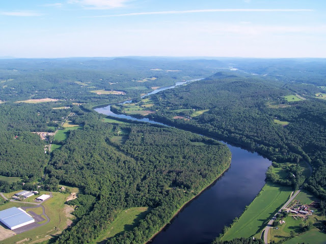 This is an aeriel view of the Connecticut River, the border between Vermont on the left, and New Hampshire on the right. Quite a geometric-looking zig-zag going on here with this river!