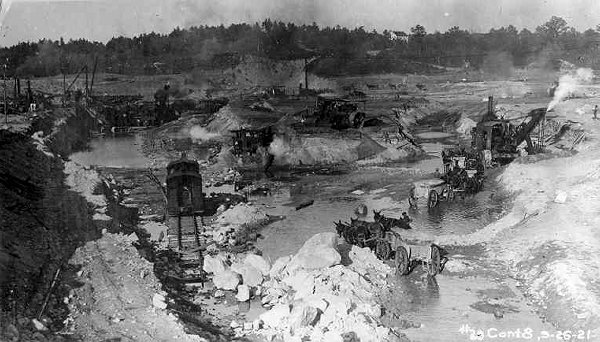 This massive public works construction project was said to have gotten underway in about 1915, and was completed by 1925. Interesting to see the low-tech-looking equipment for the project pictured here in 1921, according to the date at the bottom right…