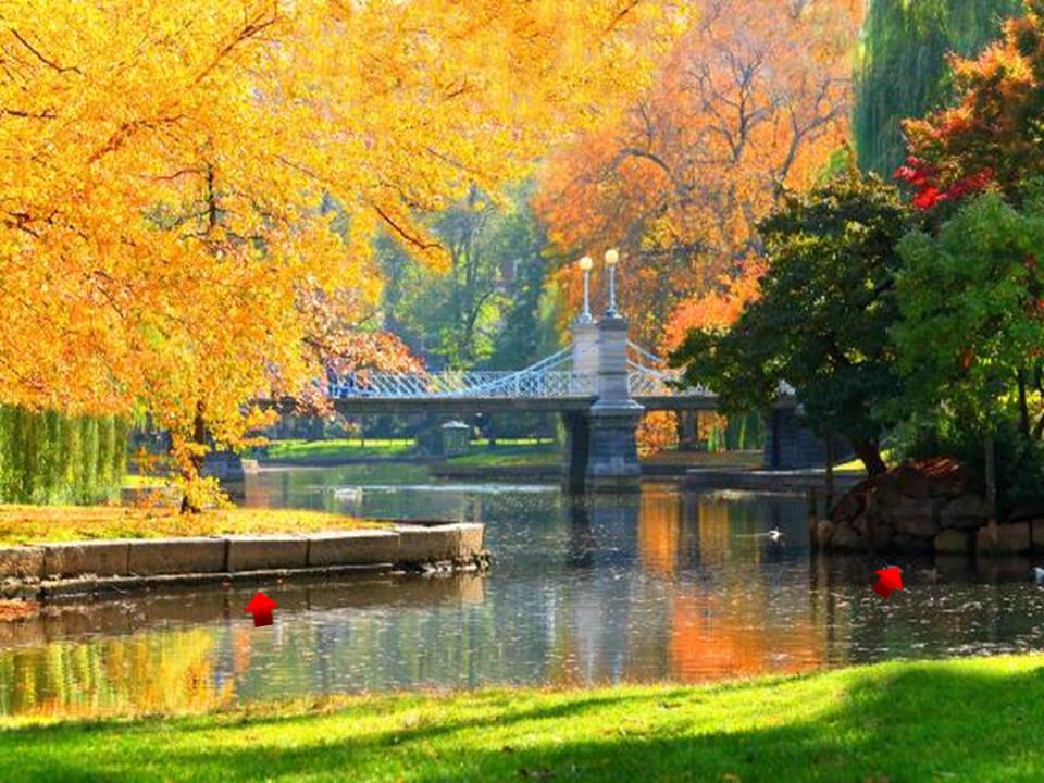 Here is an idyllic, peaceful autumn scene in the Boston Public Garden, with the beautiful bridge in the background, the stone embankment in the left foreground, and what looks like megalithic masonry in the right foreground.