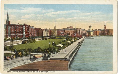 Here is a historic depiction of the Charles River Basin Esplanade, circa the time-frame of 1915 – 1930. For some reason, there aren’t many people depicted here.