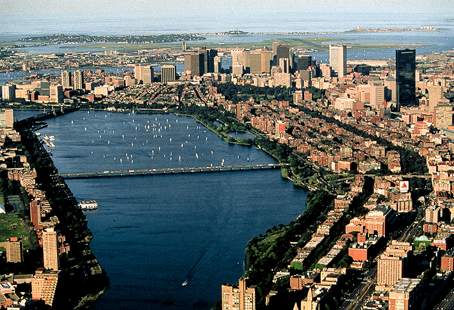 This is an aerial view of the Charles River Basin before it enters Boston Harbor.