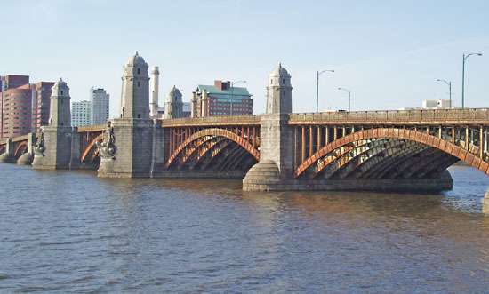 It is described as a steel-rib arch bridge connecting the Beacon Hill neighborhood of Boston, with the Kendall Square neighborhood of Cambridge.