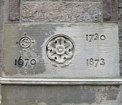 The 1730 date is said to represent the Old South Meeting House pictured here, which gained notoriety as the organizing point for the Boston Tea Party.