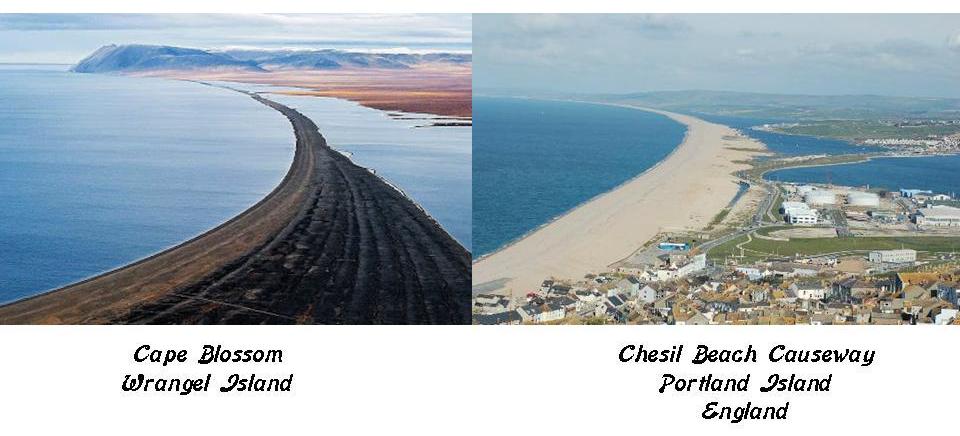 On the left is Cape Blossom, on Wrangel Island in the East Siberian Sea, off the far northern coast of Siberia; and on the right is the Chesil Beach Causeway on Portland Island, off the southern coast of England.