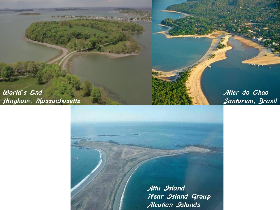 Here is another land feature on the top left at World’s End in Hingham, compared with one at the Alter do Chao Beach, near Santarem, Brazil on the top right, and another on Attu Island in the Near Island Group at the far western end of the Aleutian Islands on the bottom.