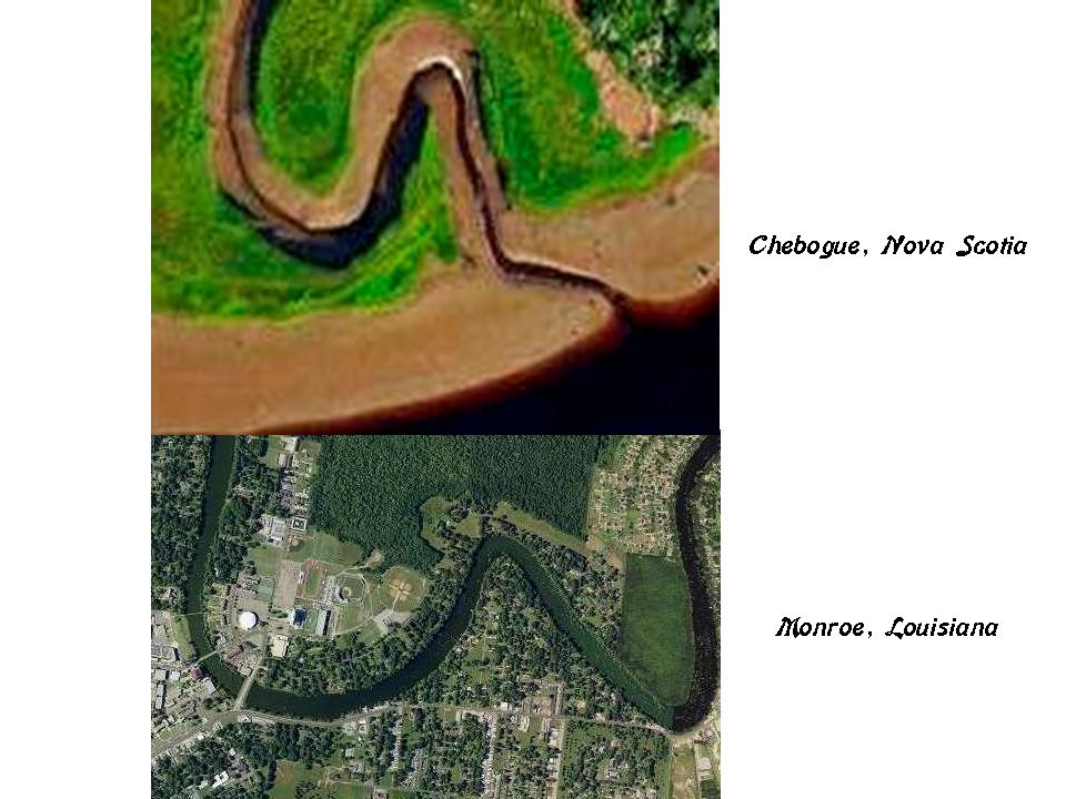 This is an aerial view taken near the Chebogue Yacht Club on the top, compared with a similar-looking S-shape in the Ouachita River in Monroe, Louisiana – two examples of many, of the same shapes recurring in the world’s river systems.
