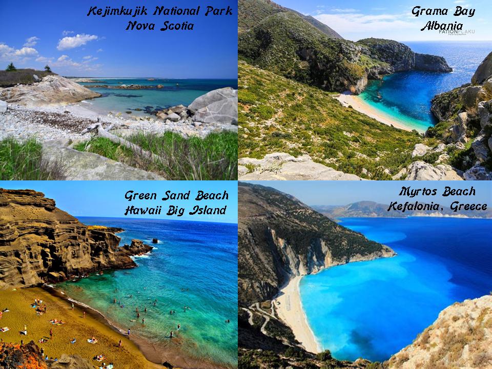 Here is a comparison of a beach-head at the seaside of Kejimkujik National Park Seaside on the top left; with Grama Bay in Albania on the top right; Green Sand Beach on the Big Island of Hawaii on the bottom left; and Myrtos Beach on the Greek Island of Kefalonia on the bottom right.