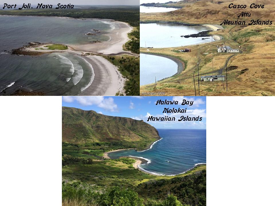 And here is a double-beach-head on the Port Joli coast-line on the top left, compared with Casco Cove, where the former U. S. Coast Guard Station was located on Attu Island, the farthest west island of the Aleutian Island chain; and on the bottom, Halawa Bay on the Hawaiian Island of Molokai.