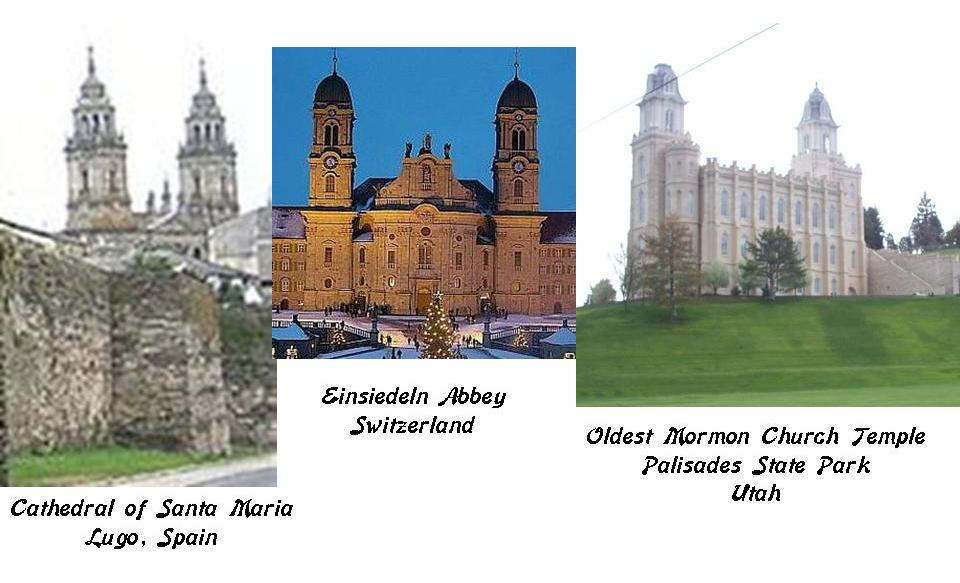 So, for example we have the same basic twin tower design of the Cathedral of Santa Maria seen above and behind the wall of Lugo on the left, in the Celtic province of Galicia, in a country that the Moors are given credit for having ruled for 700 years, ending in 1492; compared in the middle with the twin towers of Einsiedeln Abbey, a major resting place on the Way of St. James in Switzerland for centuries in a country the Spanish weren’t said to be in; and on the right with the twin towers of the oldest operating Mormon Temple in the United States, said to have been built in 1888, located in Manti, Utah in a state that was said to have been built up by Brigham Young and his Mormon settlers.