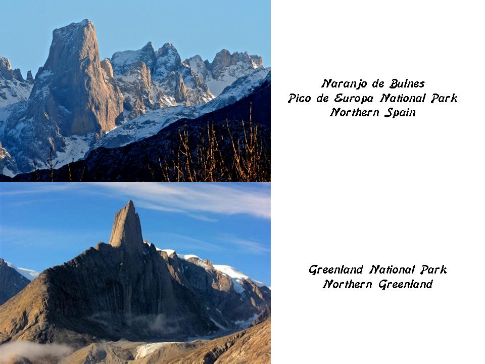 The Picos de Europa National Park is in the Cantabrian Mountains, and also within the boundaries of Castile and Leon, which is the province to where we are headed on the alignment. It was created in 1918 as one of the first national parks in Spain. This is the Naranjo de Bulnes Peak in the Cantabrian Mountains on the top, compared with what you see at the Greenland National Park in northern Greenland on the bottom.