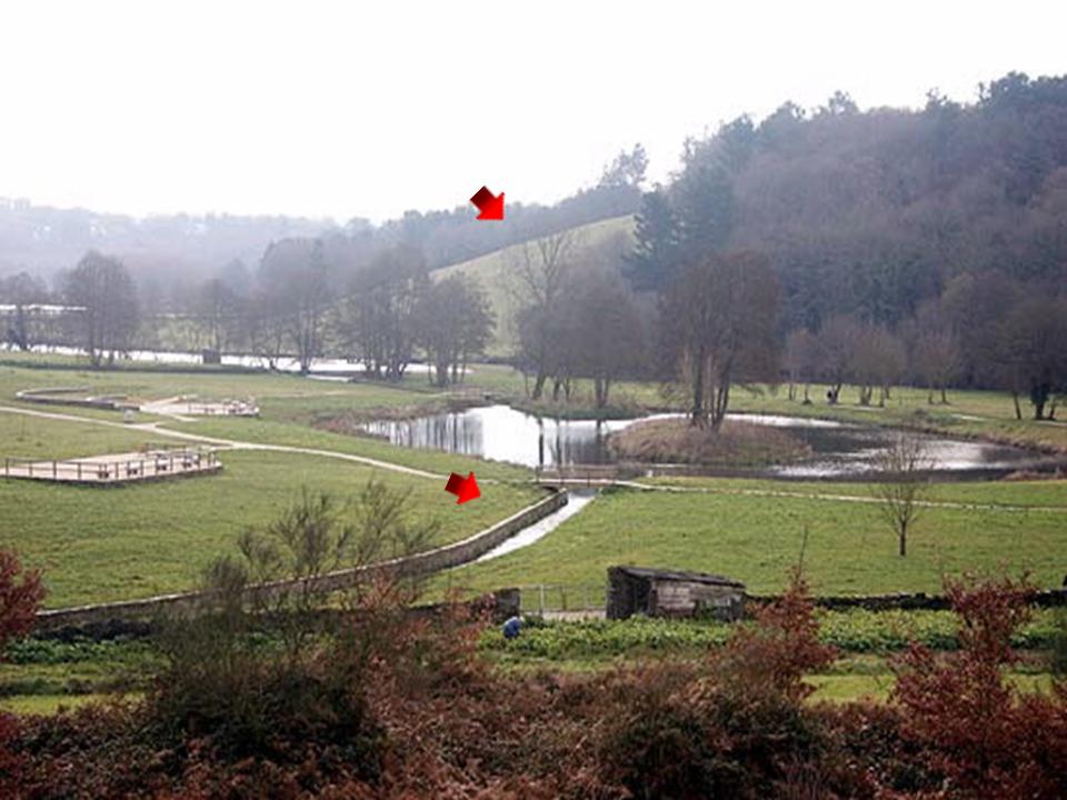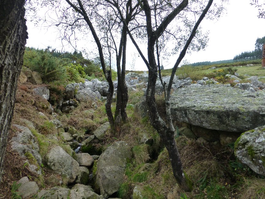 Here are some masonry features of what looks like a narrow canal at the Parque de Mino in Lugo in the foreground, and the smooth shape of what looks like a mound in the background…