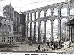 Here is an 1824 drawing of the Segovia Aqueduct by Edward Hawke Locker. Again, note the size of the infrastructure contrasted with the size of the people depicted here, and the rudimentary transportation of the horse-and-buggy.
