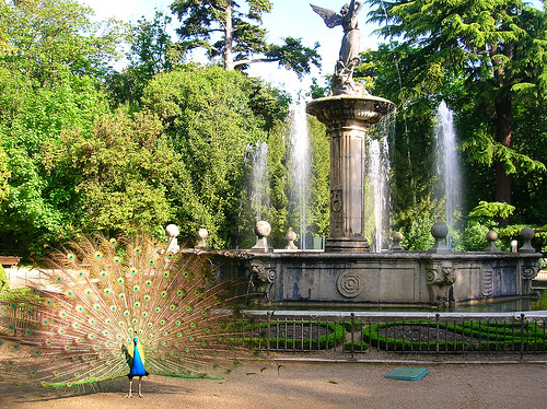 Here is another water-fountain at the lake, and one of the peacocks that the park is known for having on the grounds.