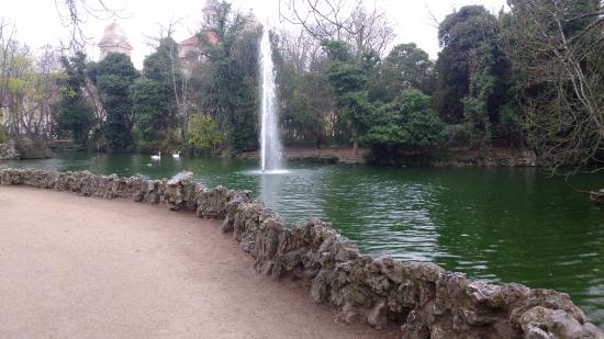 Interesting to note what looks like ancient stones in the wall around the lake in the park with this water fountain.