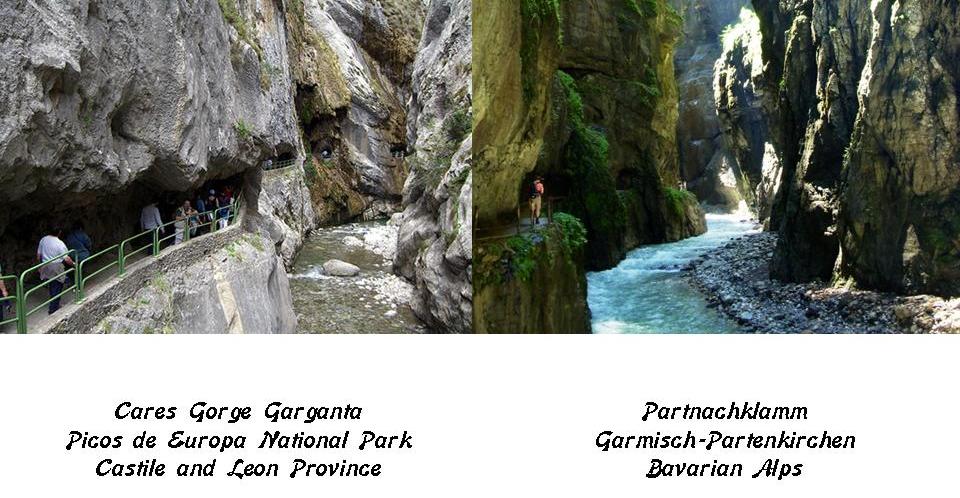 On the left is the Cares Gorge Garganta in the Picos de Europa National Park, known as the “Divine Gorge,” and considered one of the world’s best walk, treks, hikes, and climbs. On the right is the similar-looking Partnachklamm Gorge in the Bavarian Alps of southern Germany, near Garmisch-Partenkirchen.