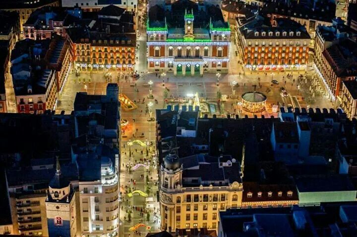 This is an aerial view of the Plaza Major in Vallodolid, with a view of the ornate City Hall in the background.
