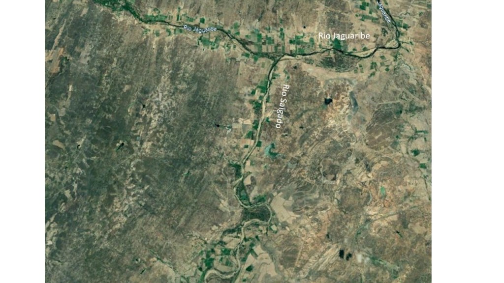 It is situated on the Rio Salgado, on a flat plain, not far from its confluence with the Rio Jaguaribe.