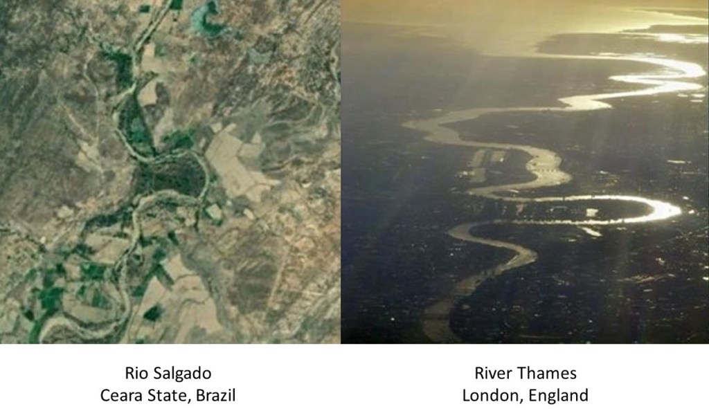 S-shaped, snaky rivers are a signature of the Advanced Ancient Civilization worldwide. For comparison of similarity of appearance, the Rio Salgado in Brazil is on the left, and the River Thames in England on the right.