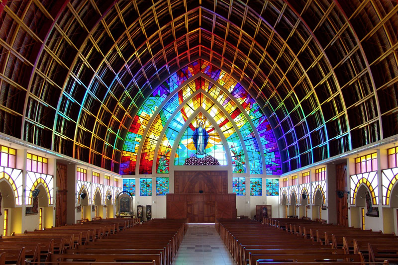This is what it looks like on the inside, with its beautiful stained glass, and apparent lack of internal pillar supports for the structure.