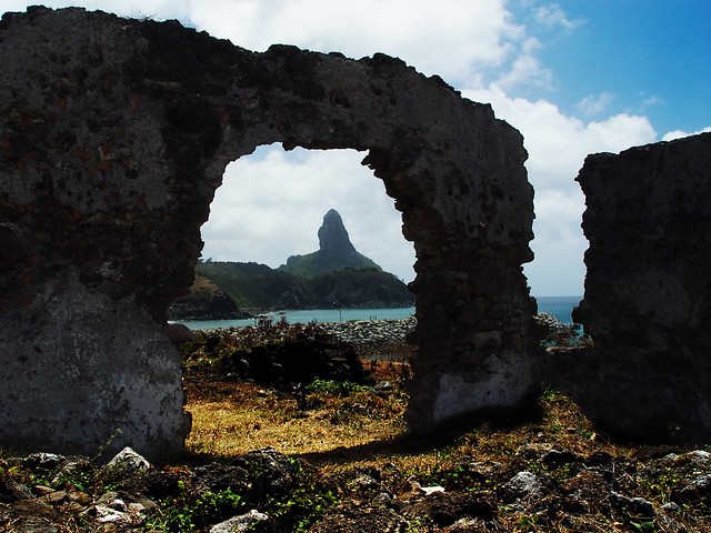 Off the coast of Brazil, the Morro do Pico as seen from the arch at the Fort Santo Antonio on the island of Fernando de Noronha…