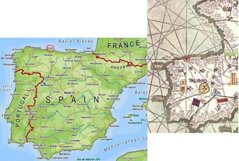 I placed a modern map of Spain on the left when I was doing research for “Circle Alignments on the Planet Washington, DC – Part 13 Madrid, Spain to Albacete, Spain,” with the city of Gijon circled, because the circle with sixteen sections depicted in the Catalan Atlas on the right appears to center on the city of Gijon. It indicates a past importance to Gijon that is no longer recognized. I, for one, had never heard of Gijon before.