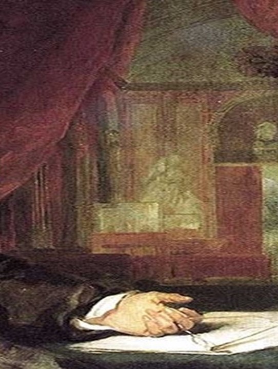 On the left side of his portrait, you can see what looks like what could be the window sill…or could be the faint outlines of a building.
