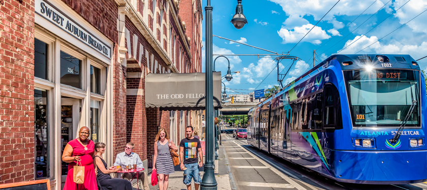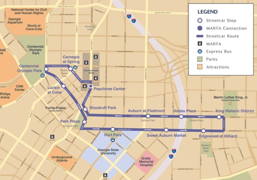 As a matter of fact, one of the streetcar lines has returned to Atlanta. A 2.7-mile, or 4.3-kilometer, streetcar line opened in Atlanta in December of 2014 between Centennial Park, going east along Edgewood Avenue to the Martin Luther King, Jr. National Historic Site, and west along Auburn Avenue.