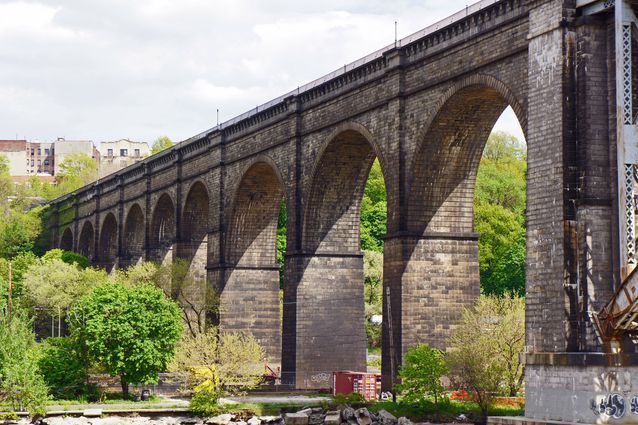 Let’s take a look at what is found in Harlem itself, starting at the Macombs Dam bridge, which crosses the Harlem River between Yankee Stadium in the Bronx and Harlem, said to have opened in 1895, and the third-oldest bridge in New York City.