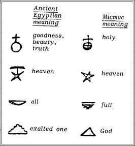 This is totally hidden information, so the best I can do right now in support of this assertion is to show you a comparison of the similar meanings of some Egyptian Hieroglyphs compared with that of the Micmac, or Mi’kmaq, an Algonquin-speaking nation of what is now eastern Canada and the State of Maine.