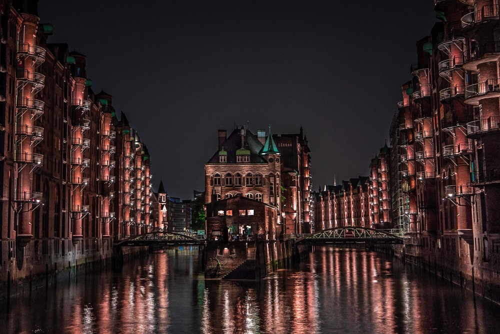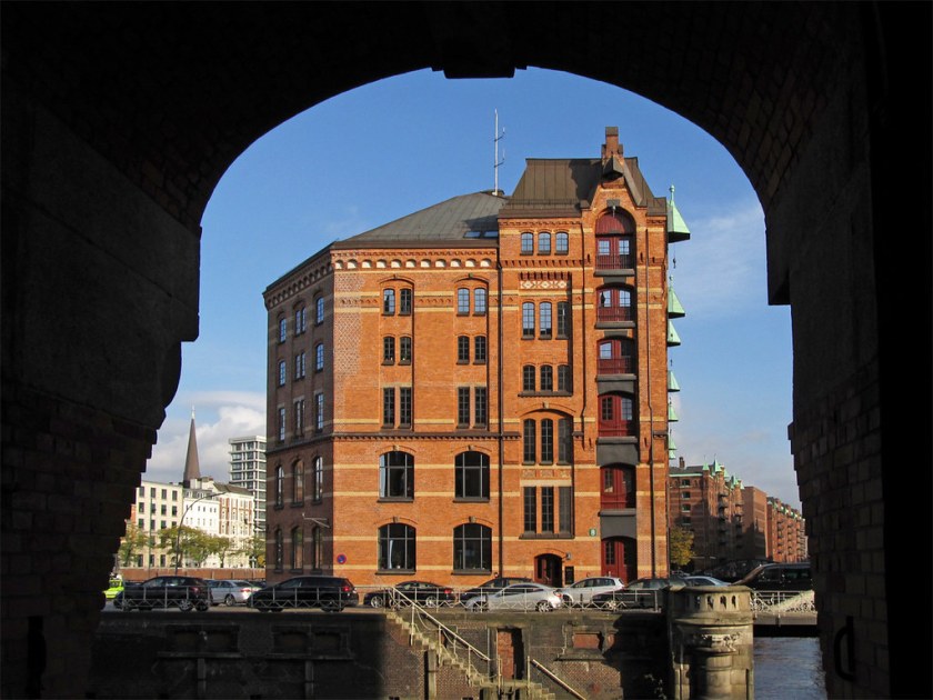 Other interesting architecture of Hamburg includes this location with buildings on what looks like an artificial island, situated in the middle of a canal, connected by bridges to the towering buildings on both sides of it…