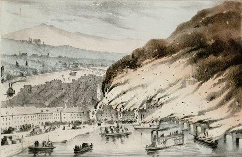 The Great Pittsburgh Fire was said to have been started by a woman who worked for Colonel Diehl on Ferry Street, who had just stoked a fire to heat wash water. This is a detail from a Nathaniel Currier print.